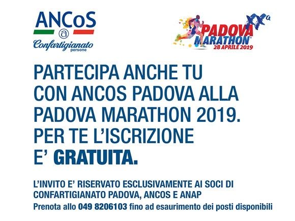 Il prossimo 28 aprile a Padova avverrà la “Padova Marathon 2019”. La XX maratona a cui il nostro comitato parteciperà. L’invito è riservato esclusivamente ai soci di Confartigianato Padova, ANCoS e Anap.