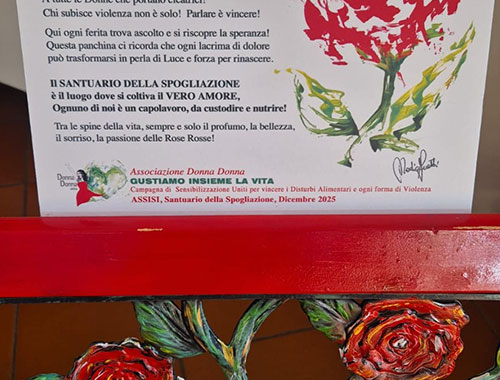 La Diocesi di Assisi-Nocera Umbra-Gualdo Tadino e il Santuario della Spogliazione di Assisi hanno accolto la donazione della prima panchina rossa contro la violenza sulle donne, un simbolo pubblico che richiama attenzione, responsabilità e impegno quotidiano. L’iniziativa è stata realizzata grazie all’impegno di Nadia Accetti e della sua Associazione Donna Donna Onlus, da tempo attiva sui temi della violenza e dei disturbi alimentari, in collaborazione con ANCoS Aps.